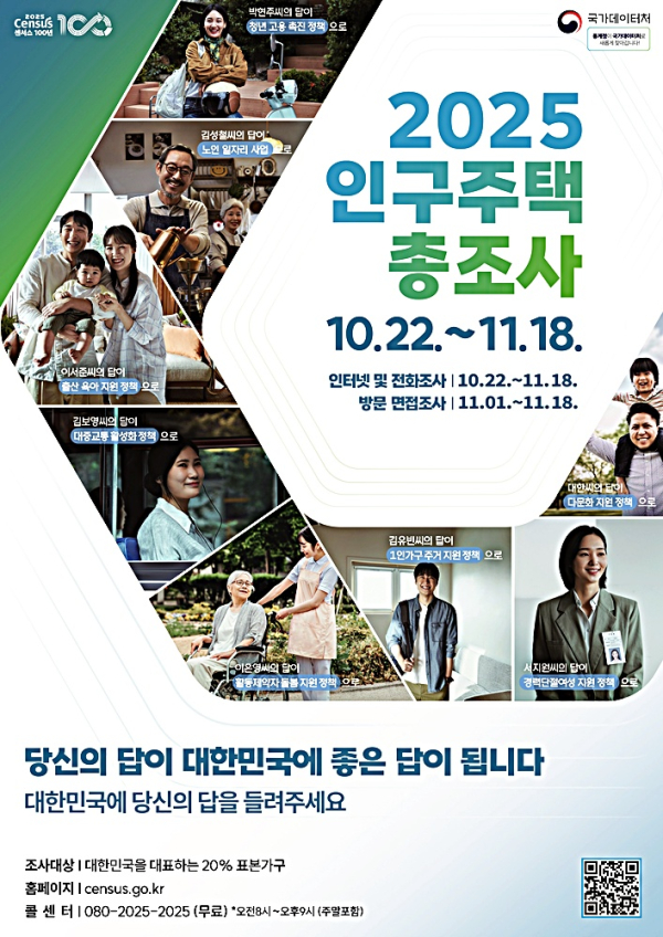 2025 인구주택총조사는 우리 모두의 미래를 위한 중요한 발걸음입니다. 인터넷이나 전화로 쉽게 참여해 국가 통계에 힘을 보태세요. 자세한 사항은 census.go.kr에서 확인하세요.