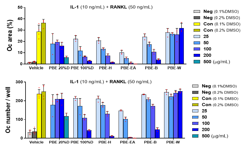 | 세포 실험 | 쥐 골세포 유사 세포주(MLO-Y4)에 파골세포 분화 유도 후 추출물 처리 | 파골세포 수와 면적 감소 (뼈 흡수 억제) |