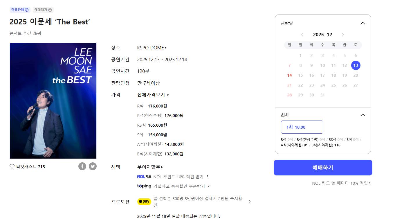 | 서울 | KSPO DOME | 2025.12.13 (토) ~ 12.14 (일) | 18:00 / 17:00 |
