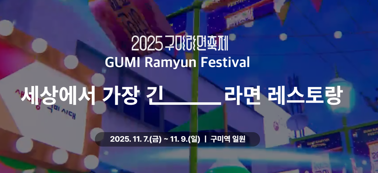 | 시식·판매 | 라면레스토랑 | 11.7 ~ 11.9 (10:00~20:00) | 구미역 광장 | 구미 대표 맛집·전국 이색 라면·아시아 누들 50여 곳 참여, 토핑(풋고추, 어묵 등) 추가 가능 |