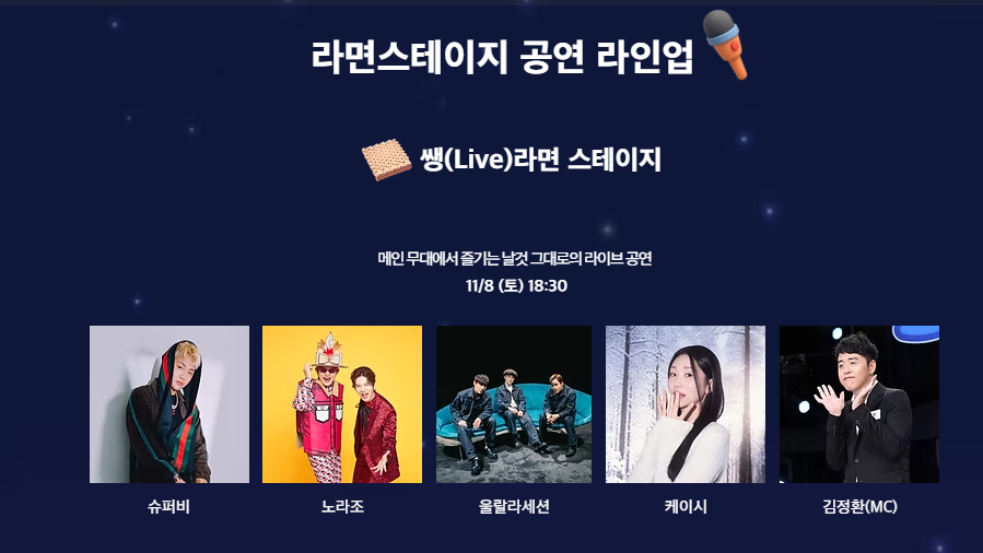 - 쌩(Live)라면 스테이지 (11.8 토, 18:30 ~ ): 슈퍼비, 울랄라세션, 노라조, 케이시 출연, MC 김정환. 메인 무대 라이브 공연으로 축제 클라이맥스.
