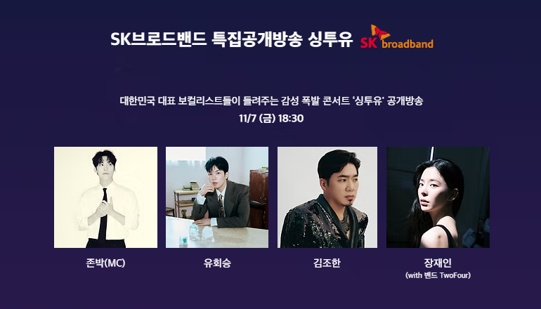 - SK브로드밴드 특집공개방송 싱투유 (11.7 금, 18:30 ~ ): 김조한, 유회승, 장재인 (밴드 TwoFour와 함께) 출연, MC 존박. 대한민국 대표 보컬리스트들의 감성 콘서트 공개방송.